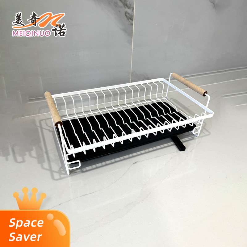 Premièrement, il offre une excellente organisation. Les multiples fentes du support vous permettent de placer soigneusement la vaisselle, les assiettes et même les planches à découper à la verticale, garantissant qu'ils sèchent rapidement et soient faciles d'accès. Cela aide à garder votre comptoir de cuisine bien rangé et sans encombrement. Deuxièmement, la combinaison de matériaux améliore à la fois la durabilité et le style. Le cadre en métal robuste garantit une utilisation à long terme et peut supporter le poids de divers plats, tandis que les poignées en bois ajoutent une touche de chaleur et d'élégance, ce qui en fait une pièce visuellement agréable dans la cuisine. De plus, il favorise un drainage efficace. Le bac d'égouttage noir en bas retient les gouttelettes d'eau, les empêchant de s'accumuler sur le comptoir et gardant la zone propre et hygiénique.